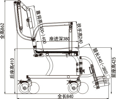 扶手可掀起,便于使用者向床上或輪椅上移乘。也減輕護(hù)理人員的工作負(fù)擔(dān)。